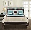 Jardin 8piece. Comforter Set: One comforter, two standard shams, two European shams, one bedskirt, one breakfast pillow, and one square pillow. Jardin 8-piece comforter set will have you wanting to redecorate every bedroom in your home – all with the same bedding collection. With the sagging economy, everyone is looking for great looking products at a good price. The Jardin 8-piece comforter set gives you that and so much more. You get beauty, comfort, style and all at a great price. This collection gives a completely new meaning to "bed in a bag" collection. Jardin 8-piece comforter set begins with the thick and soft comforter. You'll never have to worry about being cold on those chilly winter nights we tend to have far too many of. This comforter is as thick as it is beautiful. The reversible comforter features a rich, chocolate brown background with a light blue allover floral/leafy pattern at the foot of bed. Even your children will always know the top from the bottom when making the beds. Jardin 8-piece comforter set is offered in various sizes, so you can decorate any room in your home - your room, your child's room or even the guest room. Included in this fashion statement are two standard shams, two European shams, a bedskirt, a rectangular breakfast pillow and a square decorative pillow. Everything you could want in a complete bedding collection you'll find in the Jardin 8-piece comforter set. Jardin 8-piece comforter set is the main item in this collection, but each piece adds its own touch of class. The square decorative pillow and Euro shams are all solid blue, while the breakfast pillow is solid brown and filled with the light blue leafy pattern. The standard shams feature a brown ribbed look with a wide solid brown edging and light blue floral design. The solid brown bedskirt completes this ensemble. Put them all together and you have a room fit for royalty. Fabric: 100% Polyester Care: Dry Clean Only Spot Clean Decorative Pillows Made in China